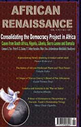 In Volume 4 No 2 2007 edition of the journal, we focused on the Democratic Republic of Congo, often referred to as the DRC, and formerly known variously as the Congo Free State, Belgian Congo, The Congo, Congo/Leopoldville, Congo/Kinshasa and Zaire. The DRC is a country rent by ethnic strife and civil war since 1994, culminating in the First Congo War that toppled Mobutu in 1997. We noted that since 1998, the country has suffered greatly from the impacts of the devastating Second Congo War (sometimes referred to as the African World War), and believed to be the world's deadliest conflict since World War II. Contributors to the issue discussed these conflicts, efforts at mediation, and current talks of post conflict reconstructions. In this issue we discuss the major challenges to the democracy project in Africa, using South Africa, Nigeria, Liberia, Sierra Leone and Somalia as case studies. We pose a central question: Are the current efforts at institut...